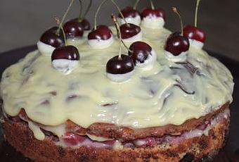 Pour le glaçage, faire fondre le chocolat blanc au bain-marie. Tremper les cerises dans le chocolat blanc fondu et les disposer sur du papier cuisson. Verser la crème dans le reste du chocolat blanc et bien mélanger.