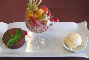 Moelleux au chocolat, sorbet au champagne, macédoine de fruits frais