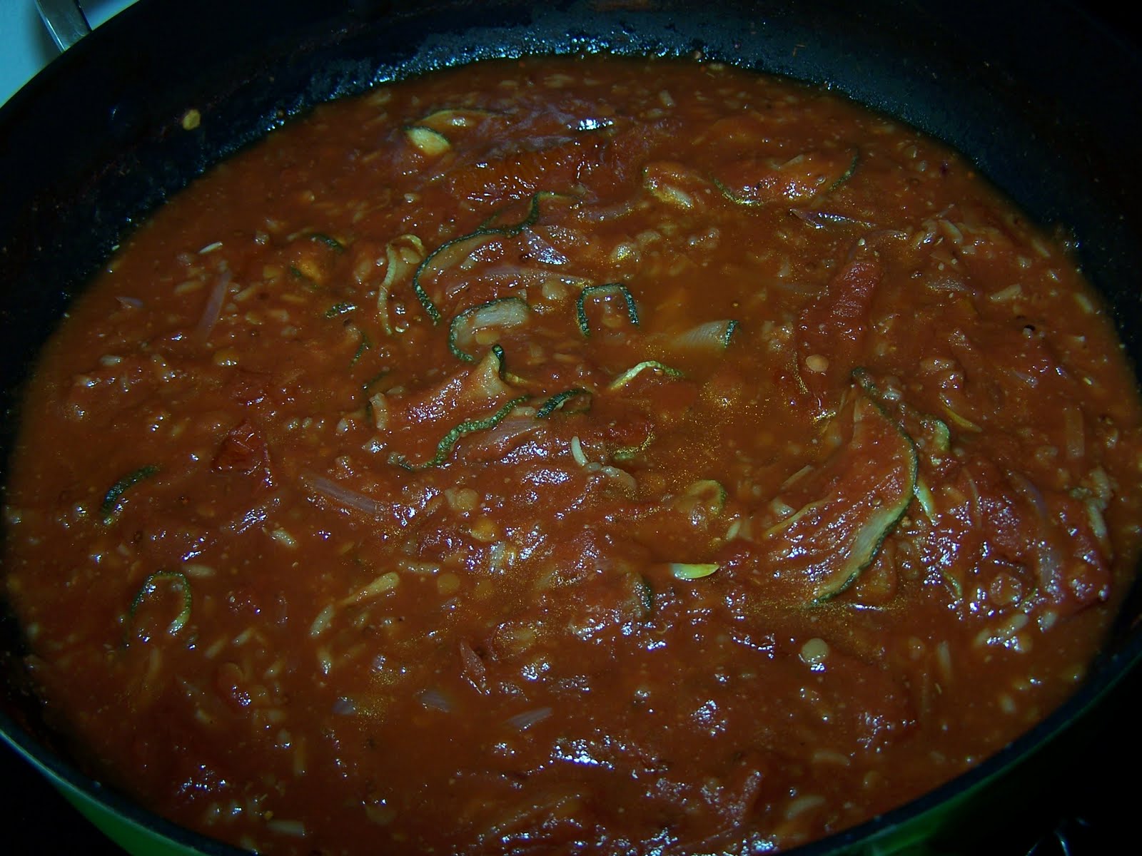 J'ai ajouté les courgettes, les tomates, le sel, l'ail, le piment, la chair de tomates. J'ai couvert et j'ai laissé cuire, à feu doux, pendant 15 minutes.