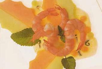 Ingrédients pour 4 personnes : 1 melon jaune, 1 melon charentais, menthe poivrée, menthe spicata, menthe monarda (mélisse).20 grosses crevettes. vinaigrette crémée au curi.