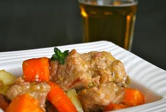 Aujourd'hui, pas de grand et beau soleil, le ciel bleu a laissé la place aux nuages et à la pluie alors rien de tel qu'un bon mijoté pour se rebouster un peu et se réchauffer. Il y a souvent de la bière dans mon frigo (un peu obligé avec mon chti chéri!), hop, ni vue ni connue, j'en ai piqué une petite pour mon sauté de porc. J'aime bien faire mijoté la viande dans la bière, elle est tendre, moelleuse et très savoureuse. Pour en faire un plat unique, j'y ai rajouté des pommes de terre et des carottes, mariage parfait. Et tout ça un peu caramélisé grâce au sucre et vous obtenez un plat, simple à faire et excellent.