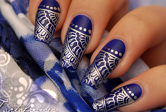 Bonjour ! Aujourd'hui voici mon premier vrai nail art avec un motif intégral de ma nouvelle plaque Konad stamping XL !! J'ai choisi de mettre un vernis miroir argenté pour bien trancher avec le bleu roi mat. C'était un vrai régal de ne pas avoir à appuyer comme une folle (et risquer de se plier l'ongle!) comme avec le tampon Konad basique, avec le tampon XL ultra mou c'était très facile ! Bon après il ne me reste plus qu'à maîtriser la symétrie des motifs...