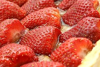 Sortir la pâte du four et laisser refroidir. Déposer une couche de compote de rhubarbe, puis les fraises coupées en deux. Servir. Accompagner éventuellement avec de la chantilly