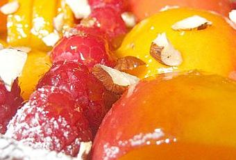 * Badigeonnez les fruits de sirop et parsemez de quelques éclats de noisettes, d'amandes.