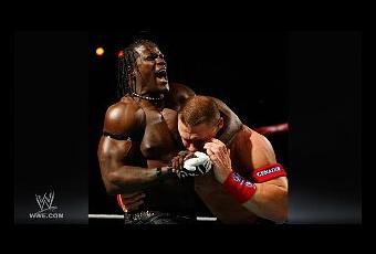 Très Vite R-Truth, qui ne fait pas le poids ni techniquement ni physiquement, va quitter le ring pour apostropher des gens du public.