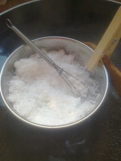 2/ Dans mon bol inox, je prépare ma base de shampoing : je mélange les tensioactifs solides,l'émulsifiant et les huiles végétales :