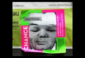 Grattez et gagnez une œuvre de Christian Boltanski à l’occasion de la 54e biennale de Venise ! Collée sur la Une de Libération datée du 3 juin, une zone à gratter afin de découvrir « son » numéro… L’autocollant montre un visage découpé en trois bandes verticales. Il évoque l’installation spectaculaire « Chance » exposée à la biennale jusqu’au 27 novembre et par laquelle l’artiste interroge le hasard et le destin : Un long ruban composé de 600 visages de nourrissons. A peine nés et déjà embarqués sur le grand huit de la mort - ou de la vie. A intervalles irréguliers, une sonnerie retentit, le fracas modéré s’arrête, le ruban ralentit, le visage d’un nouveau-né s’immobilise sous l’objectif d’un appareil photo. Il est saisi, il a été choisi. Pour concrétiser cette idée de la chance, Boltanski a souhaité concrètement mettre en place une loterie pour chacun des visiteurs : « Chacun est invité à participer à un jeu consistant à recomposer sur un écran un visage à partir de fragments de visages de bébés et de vieillards qui défilent à toute allure. S’il arrive à restituer un vrai visage en poussant le bouton au bon moment, il gagne l’œuvre», commente Jean-Hubert Martin, commissaire du Pavillon français. Le lecteur de Libération peut donc, lui aussi, s’amuser avec les lois du hasard : si son numéro est tiré au sort, il gagne une œuvre de l’artiste d’une valeur de 10 000 euros.