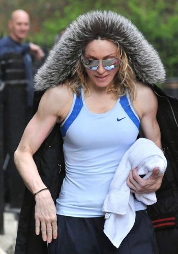A voir ses bras, peut-être que Madonna devrait picorer un peu moins de graines de lin et lever le pied sur la muscu... Un bon steak de temps en temps ne lui fera pas de mal!
