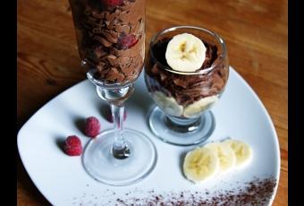 - Dresser les verrines. Chocolat au fond, puis mettre des tranches de banane contre la parois de la verrine, garnir de chocolat, ajouter des cube de bananes et finir de garnir avec la mousse au chocolat. Pour les framboises, fond chocolat puis une couche de gramboise puis chocolat et finir par une couche de framboise.