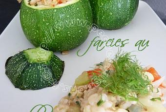 Nettoyez le fenouil et coupez le en petits dés. Faites de même avec le poivron. Pelez et émincez l’oignon et l’ail. Coupez le chapeau aux courgettes, évidez les. Hachez la chair. Ébouillantez les courgettes 3 minutes dans une eau bouillante salée. Égouttez les sur du papier absorbant. Chauffez le four à 180°C. Dans une cocotte, faites chauffez la moitié de l’huile et faites revenir l’ail, l’oignon, le fenouil, le poivron, la chair des courgettes pendant 5 minutes. Ajoutez le blé, et faites cuire 3 minutes. Versez 15 cl de bouillon de légumes et laissez cuire 8 minutes. Le blé doit être tendre. Ajoutez le parmesan et un peu de persil haché. Salez, poivrez. Farcissez les courgettes. Disposez les dans un plat huilé, replacez les chapeaux. Arrosez avec le reste du bouillon et faites cuire 15 minutes au four. Servez les courgettes entourées d’une ou deux cuillère de blé supplémentaire. Décorez avec des pluches de fenouil.