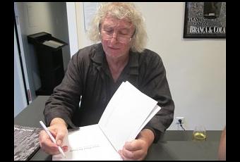C’est bien ainsi que l’on s’imagine un artiste sculpteur de surcroît, le visage buriné, la tignasse grise, bouclée en bataille, les lunettes portées sur le bout du nez, font penser à un nain « très »travailleur de Blanche-Neige, peu bavard en public, il signe avec modestie son catalogue, son autoportrait est tout à fait fidèle.