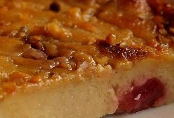 Equeuter les cerises et les répartir dans un plat de 24 cm de diamètre. Verser dessus l'appareil précédent. Disposer dessus les amandes effilées/hachées. Et saupoudrer très légèrement de sucre.