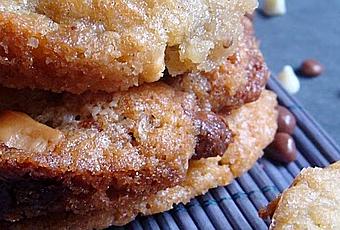 A l'aide d'une cuillère a soupe, prélever un peu de pâte. Former des tas en les espaçant de 5 cm environ (il y a beaucoup de beurre donc les cookies ont une furieuse tendance à s’étaler) et les déposer au fur et à mesure sur une plaque de cuisson recouverte de papier sulfurisé Faire cuire 12 minutes environ jusqu'à ce que les cookies soient dorés.A la sortie du four, les déposer sur une grille à pâtisserie et les laisser complètement refroidir.