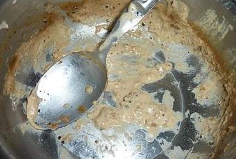 Je peux vous dire une chose, il faut vraiment avoir une gueule solide !!! Ma maîtresse a réalisé une sauce au poivre noir pour accompagner son rôti de boeuf, et forcément qu'il en restait de la sauce ! Domi débarasse la table et emporte la précieuse casserole dans la cuisine.
