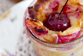 Disposez les cerises dans le plat ou les ramequins puis versez le mélange dessus et mettez au four. Laissez cuire 30 à 40 minutes.