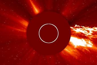 Le célèbre satellite SoHO qui a déjà couvert un cycle solaire (le précédent, cycle 23) a lui aussi livré ses images et vidéos de l’énorme éruption solaire. Sur la vidéo ci-dessous, ont peut découvrir l’éjection de masse coronale propulsant des particules solaires à des vitesses supérieures à 1 200, voire 1 600 kilomètres par seconde ! L’image est brouillée par la « déflagration » électro-magnétique, les particules heurtant le capteur.