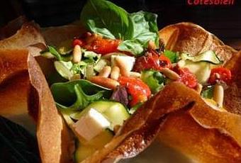 Il ne vous reste plus qu’à garnir ces magnifiques coroles de salade et de tous ces légumes colorés, de fromage ; parsemez-le tout de pignons de pin grillés et de feuilles de basilic pour leur merveilleux parfum.