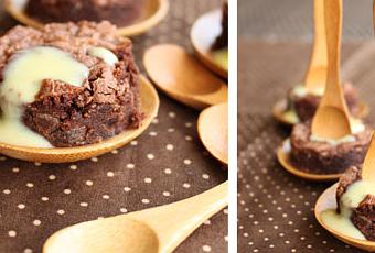 Pour ma première série de photos, je voulais que les deux soit réunis… Je pense que le pari est gagné. Juste ce qu’il faut de crême anglaise pour ne pas déborder, la texture mousseuse du brownie pour accueillir avec tendresse la mini cuillère en bois de bambou. Les enfants étaient ravis!