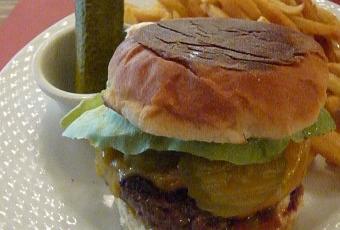 Une belle assiette arrive, avec un burger fort appétissant. La viande est couverte de cheddar fondu, avec tomate, salade et cornichon pickle (plus un gros cornichon supplémentaire tout croquant à coté). L'ensemble est juste un peu difficile à manger car très haut : il faut dire aussi que je ne suis pas une pro des hamburgers ! Je le mange sans le pain du dessus et cela va mieux.