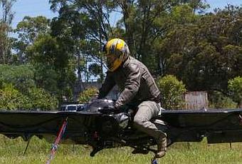 Chris Malloy a réalisé un prototype de moto volante baptisé Hoverbike doté d’un moteur bi-cylindre de 1170 cc de chez BMW. La machine de 3 mètres de long sur 1,3 m de large est composée de kevlar et de carbone pour un poids total de 105 kg. Capable de soulever près de 295 kg elle embarque un réservoir de 30 litres permettant de parcourir une distance théorique de 150 km (distance qui peut-être doublée par un réservoir additionnel).