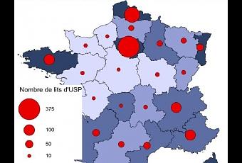 Les Unités de Soins Palliatifs (USP), conçues pour prendre en charge les situations les plus complexes, présentes dans chacune des régions françaises et dans tous les C.H.U, représentent aujourd'hui 107 unités, pour un total de 1176 lits, répartis pour l'essentiel, dans le secteur « Médecine, Chirurgie, Obstétrique » (MCO) et en soins de suite et de réadaptation. Mais leur répartition sur le territoire est inégale, deux tiers d'entre elles soit 71% des lits étant concentrées dans 5 des 26 régions françaises (PACA, Rhône-Alpes, Bretagne, Nord-pas-de-Calais et Ile-de-France). Des régions comme les Pays-de-la-Loire, Basse et Haute Normandies, Poitou-Charentes, Centre et Bourgogne restent sous-dotées.