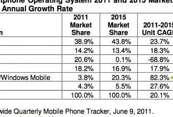 Le cabinet d’étude IDC voit Windows Phone supplanter iOS en 2015. En effet, d’après leur étude trimestrielle de l’état du marché mobile, Windows Phone pourrait acquérir 20,3% de part de marché d’ici 4 ans tandis qu’iOS n’en détiendrait plus que 16.9%. Bien évidemment Android occuperait le poste de leader avec 43.8 % du marché.