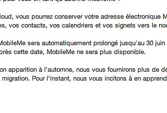 Si l’intention est louable, le message envoyé apporte au final peu d’information. Apple se contente d’inviter ses abonnés à patienter pour avoir davantage de détails quant à la procédure de migration. Il serait par exemple intéressant de savoir comment se déroulera la transition entre MobileMe et iCloud pour les utilisateurs qui stockent actuellement plus de 5 Go de données sur les serveurs Apple.