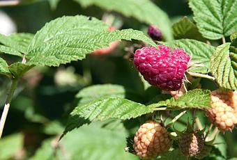 (Photo LOF – « “Royalty” Cette framboise est une exception dans son genre … Ce n’est pas une exception en elle-même, puisqu’en Amérique du Nord (où elle est née) on la retrouve dans une famille dite: “framboises pourpres”. Celle-ci possède des fruits d’un “goût” très particulier, adaptés aux confitures ou aux tartes plus qu’à la consommation en frais, bien qu’ils soient très appétissants: gros, joufflus et fournis en abondance... La vigueur de la plante est impressionnante, ses tiges sont nombreuses, rigides et fort bien armées et, délicatesse pour un jardin où la couleur autant que l’intérêt sont de même importance, leur écorce est teintée de rose-violet foncé, avec du parme et du magenta! » Daniel Duret )