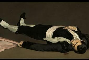 3/ Cette science de la composition est encore plus évidente devant le "Torero mort", qui est le découpage, opéré par Manet, d'une peinture plus grande : par cette réduction, il concentre les regards sur ce corps, et cette perspective incroyablement maîtrisée, les reflets du satin de la ceinture blanche-rose, le revers blanc à la manche, l'anneau à l'auriculaire, et cette minuscule tâche de sang qui suinte sous l’épaule. On regarde, planté là, fasciné par ce noir et blanc si coloré.
