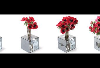 Le « Vase Universel » (Dim. : 14,5 x 14 x 14,5 cm) permet d’accueillir quatre tailles de bouquets possibles. Il comprend un récipient cubique en verre contenu dans une ceinture en acier inoxydable. Cette ceinture présente sur ses quatre côtés une ouverture de taille différente. Cela permet à ce vase d’accepter des bouquets de taille variée, depuis la rose unique que mes enfants adorent m’offrir jusqu’au petit bouquet d’anémones.