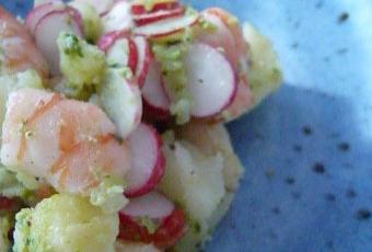 Rien de compliqué. On peut mixer les éléments du pesto (fanes de radis, amandes, parmesan, huile) un peu à l'avance. En revanche, comme elle le propose, il est vraiment préférable de faire cuire les pommes de terre au dernier moment pour les servir tièdes. Résultat : le pesto de fanes de radis était un délice, la salade une merveille de parfums et de textures mélangés. Une grande réussite. Merci Pascale !