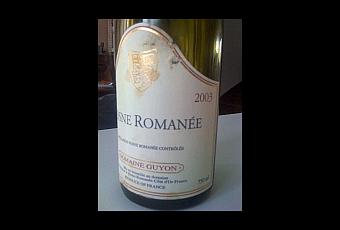Vosne Romanée Domaine Guyon 2003 : Un nez séduisant quoique discret de fruit noir mûr, à l' ouverture des notes de céleri qui disparaissent, puis la mûre, le cassis, note de ronce, fond sous-bois, et compote de fruit , léger fûmé/toasté. La bouche est corpulente, intense, tanin soyeux amples, fruit mûr sans confit, ronce, sous bois et sensation de fraicheur, fond fûmé. La finale est dynamique, mûr, longue belle persistance fruit noir mûr, pointe réglisse, fond léger fûmé. Beau vin sur le fruit sans tomber dans l'exces de maturité confit du millésime. TB 89 (15,8)