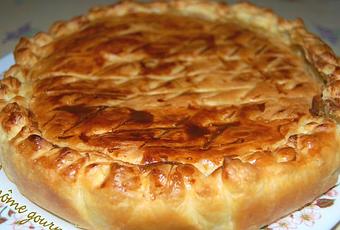 Scellez les deux pâtes en appuyant les bords avec une fourchette ou simplement en pinçant avec les doigts ; au besoin mouillez légèrement avec un peu d'eau du bout des doigts pour que ça colle plus facilement. Pratiquez une petite ouverture circulaire au centre et placez-y une "cheminée" confectionnée avec un petit morceau de papier sulfurisé (je n’ai pas fait). Dorez au jaune d'oeuf à l'aide d'un pinceau de cuisine. Vous pouvez faire des dessins avec la pointe d’un couteau (mes conseils : pour que les dessins se voient bien sur la pâte après cuisson, il faut déjà que la pâte soit bien fraîche donc sortez-la du réfrigérateur seulement au dernier moment, il faut que le four soit bien chaud avant d'enfourner la tourte ; faites les dessins sur la pâte seulement lorsque vous aurez doré la pâte au jaune d'oeuf, je délaye le jaune avec un tout petit peu de lait pour que cela s'étale mieux).
