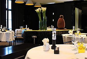 Des murs noirs, jouant avec le côté lumineux d'un jaune qui met en éclat cette nouvelle salle de restaurant fraîchement achevée. Le plafond est une sculpture ouverte sur un ciel immaculé. C'est une franche réussite.