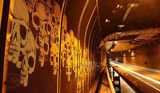 Alexandre Orion is a Brazilian tagger that got famous doing clean tags of skulls in a tunnel of Sao Paulo.