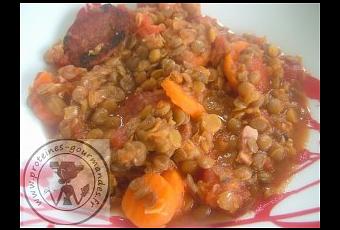 Une fois cuite, retirer le bouquet garni et ajouter le cube émietté, les carottes, les tomates, lardons et chorizo et laisser mijoter pendant 30mn à feu doux à couvert