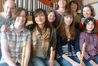 Photo : élèves et professeurs des classes d'orgue et de flûte à bec dans la salle d'orgue du CRD d'Oyonnax.