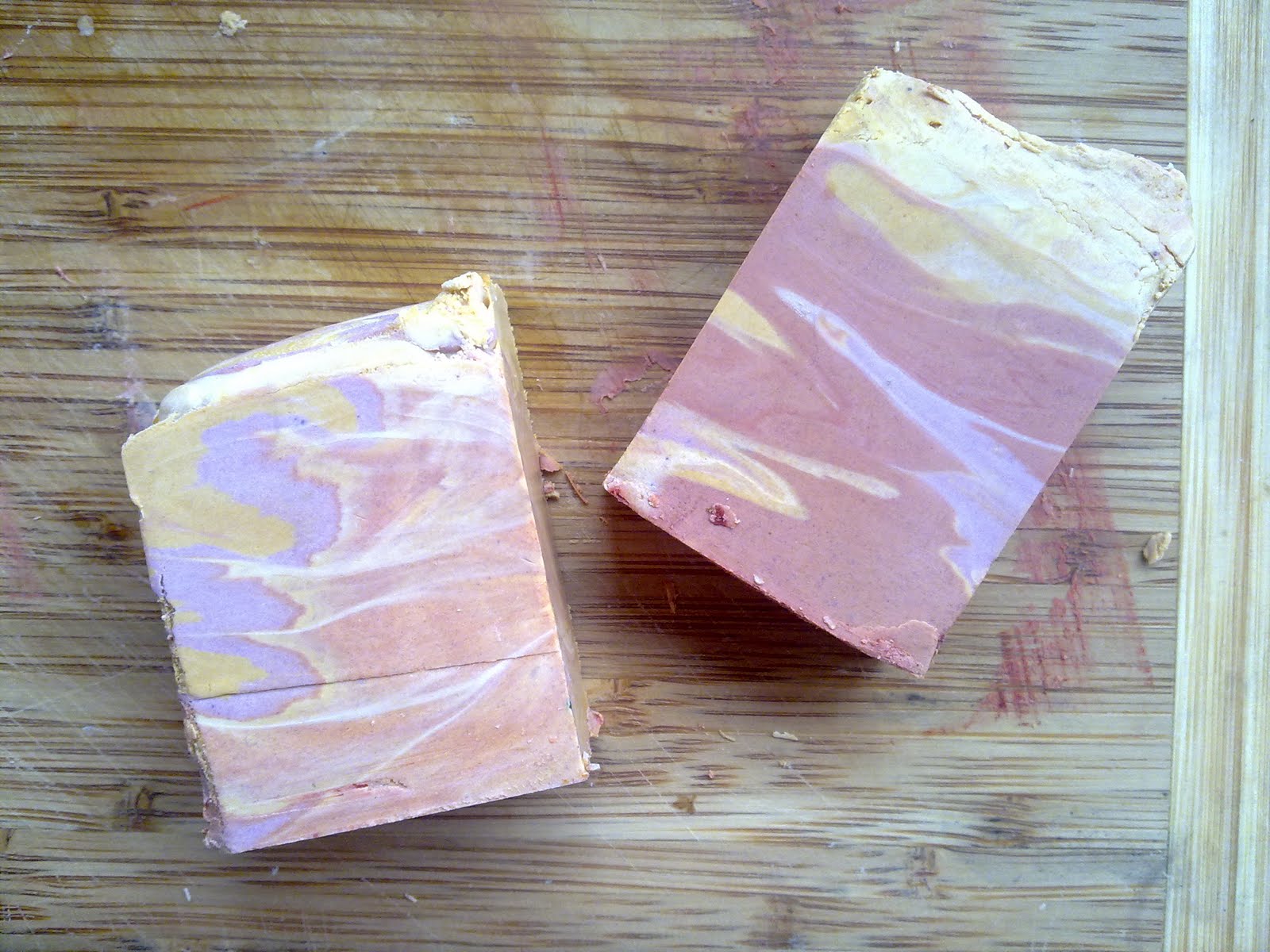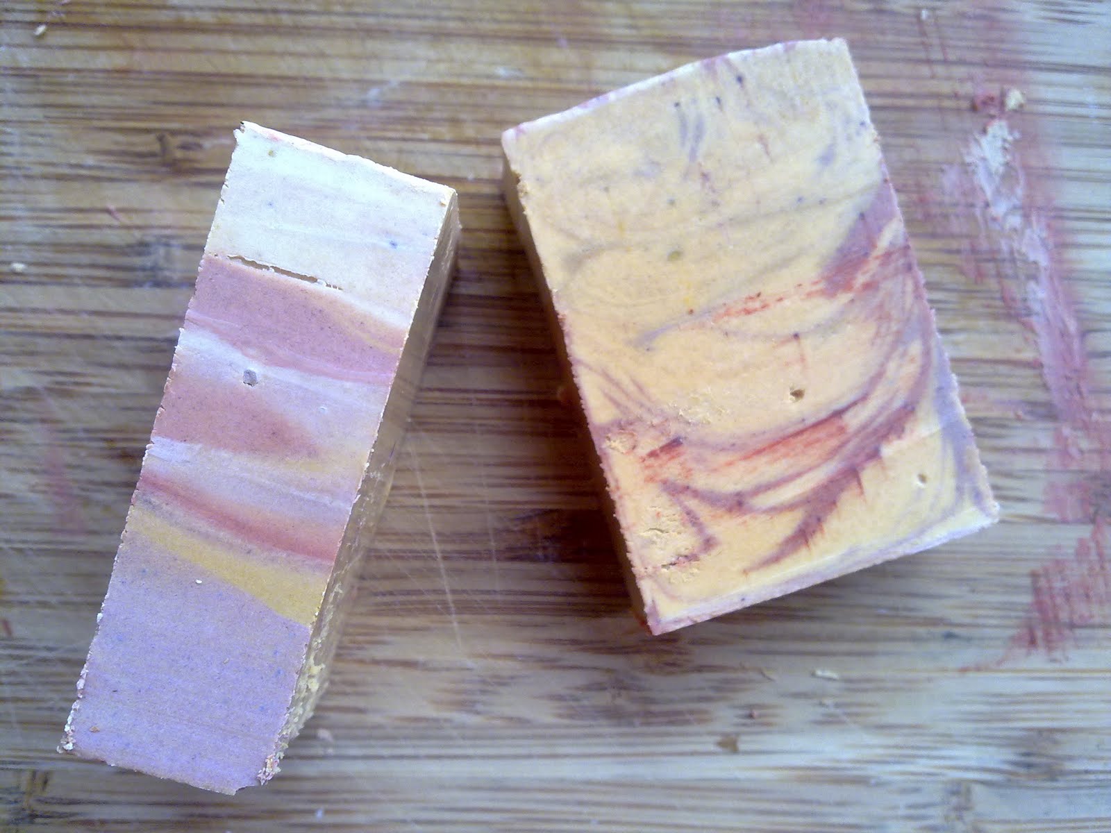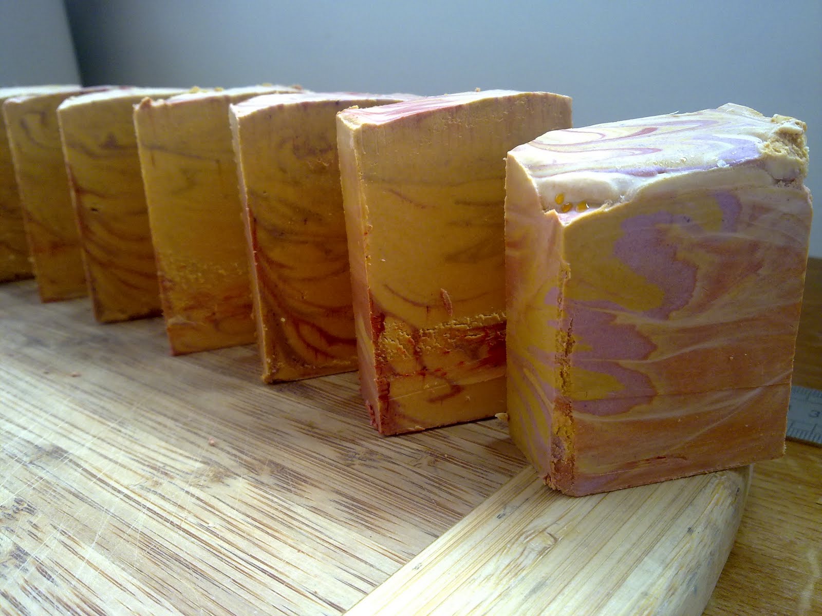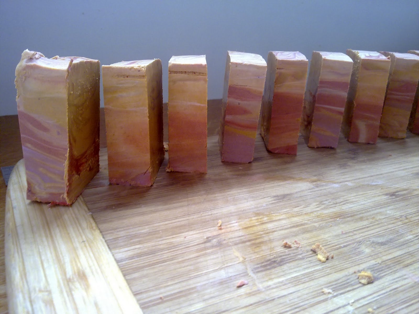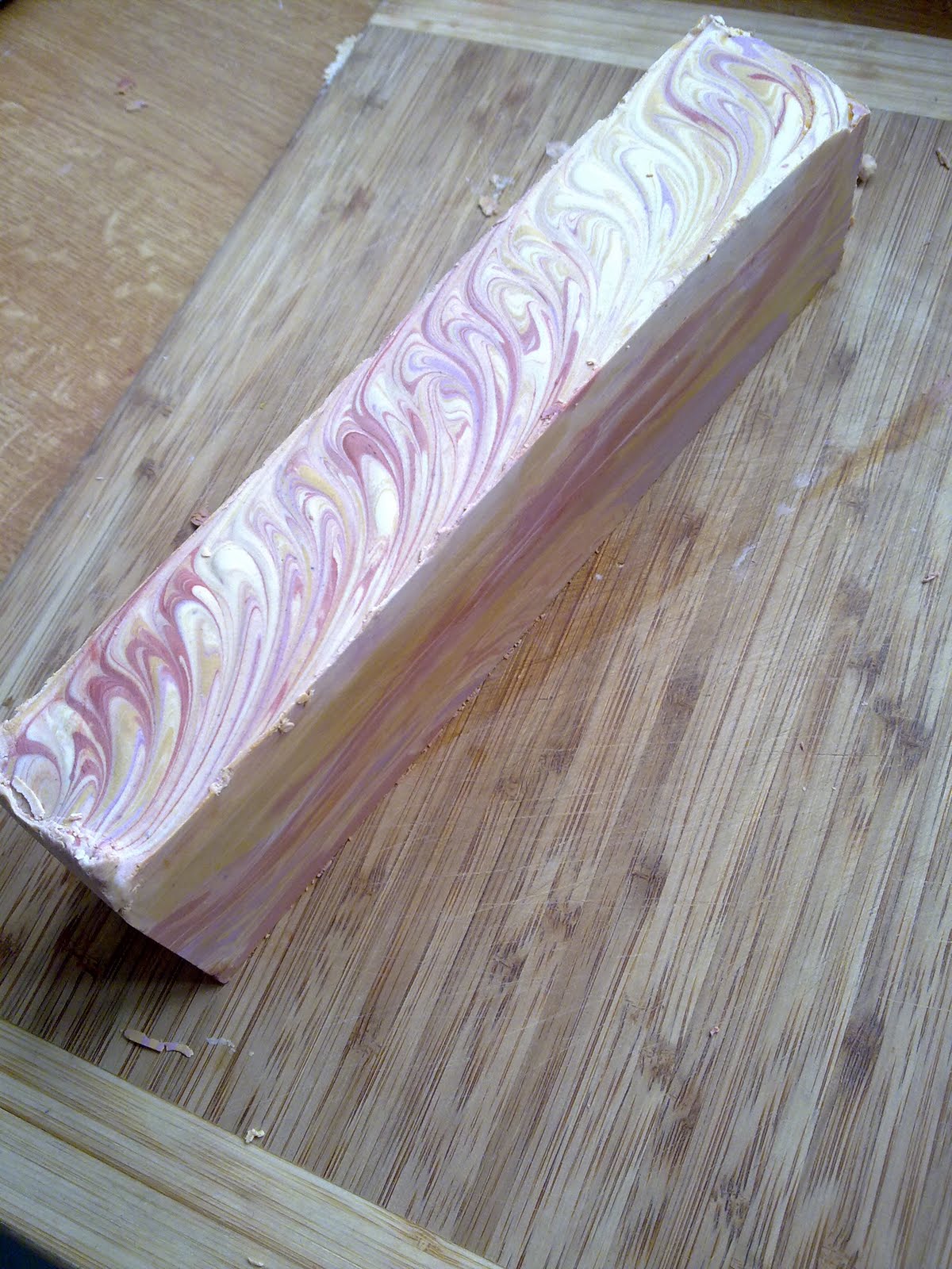 Après un démoulage délicat, merci l'effet ventouse.... Voilà les photos du savon fraîchement démoulé et découpé...