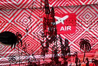 ...simple monogramme sur un emballage carton aux motifs géométriques s'inspirant des impressions de paréos ou de tout autre voilage decontrées lointaine...Déposé sur un trottoir, emmailloté dans un film translucide, il n'en perd pas moins de sa puissance évocatrice et d'appel au voyage...et il me suffit de quelques coups de crayons surimposés pour dessiner la destination rêvée et me projeter BY AIR dans un autre univers où blottir nos envies d'ailleurs et quitter ce trottoir d'un environnement noircit de nos inquiétudes.