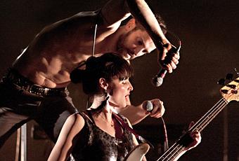 Concrètement?La première heure séduit l'oeil à plus d'un égard. A l'ouverture, un chanteur exécute une série de poses avec son micro sur pied: les sons, les mouvements et la lumière donnent à cette séquence des airs d'immortalité. Un hommage à la mythologie du rock. Un instant fort où le temps se fige et où l'on entend presque les hurlements hystériques d'un public fantôme. Noir. Fumigènes. Ou comme si... " Un paysage instrumental mouvant" apparaît soudain. Les cymbales sont d'immenses champignons aux effets hallucinogènes, les loupiotes électriques des lucioles inquiétantes et le chanteur, d'Alice inquiète se frayant un chemin dans cette jungle, se métamorphose peu à peu en animal, retrouve ses pulsions primitives. Poussent alors des hommes - plantes qui jouent aussi au jeu des transformations. Au gré de multiples tableaux, apparaissent des monstres étonnants mi-homme, mi-objet qui effrayent et séduisent tout autant. Des chants séraphiques s'élèvent portés par des voix aux timbres aussi singuliers que superbes. La musique et la poésie font corps, l'humour s'immiscant au milieu de ce couple complice, donne à voir des Clowns Rock qui s'amusent avec les clichés de la scène musicale, tentent l'absurde ( en jouant sans instrument, en faisant de leurs corps des instruments) et offrent aux ratés de la scène leur heure de gloire. Bravo notamment à la délicieuse Mélanie Chartreux , sirène argentée dont chaque mouvement est d'une grande esthétique et qui se transforme en poupée de son qui a, notamment, quelques problèmes de réception fort drôles.