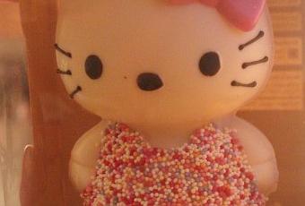 N'étant pas en France à la période où Pâques commençait à envahir les rayons des magasins, j'ai complètement zappé d'écrire un article sur les produits Hello Kitty ( ouups) ! Mais si ici nous avons plusieurs sortes d'oeufs , les mallettes , bols &Co , regardez un peu ce qui se vendait dans les grands magasins Marks and Spencer : une Hello Kitty super mignonne en chocolat blanc et décoration en couleurs ! Je me vois mal croquer dedans ...