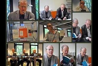 photos ©florence trocmé, en haut montage de différentes photos, puis de haut en bas Stéphane Chaumet présentant le livre, Alain Lance jouant le Temps des cerises, Volker Braun et en bas, de gauche à droite, Alain Lance, Volker Braun et Jean-Paul Barbe