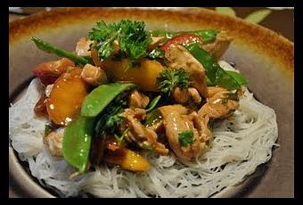 - Dans une grande poêle huilée, sur feu moyen-vif, faire dorer le poulet de 4 à 6 minutes. Ajouter les prunes et les nectarines. Remuer jusqu’à ce que les fruits commencent à ramollir, environ 2 minutes. Remuer la sauce et verser sur le poulet. Ajouter les pois et les oignons verts. Remuer jusqu’à ce que le poulet soit cuit et les pois tendres mais croustillants, environ 2 minutes.