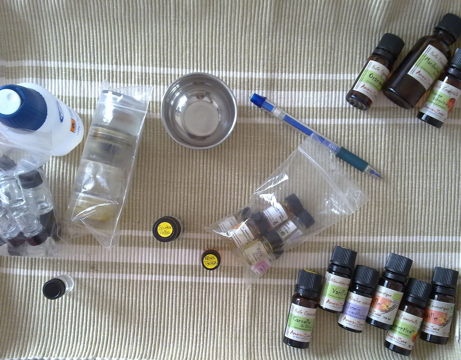 1/ Avant de me lancer, je prépare ma "table" : le matériel, les substances aromatiques qui m'intéressent, les marmottes pour tester les associations par note, le flacon, et mon petit bloc-notes pour noter exactement, à la goutte près, la composition de mon parfum.