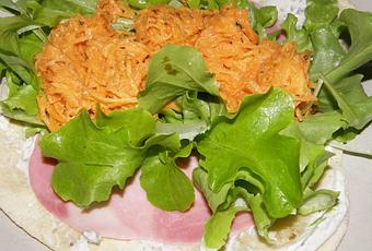 1 bonne cuillère de sauce blanche maison , 1 tranche de jambon , 1 ou 2 feuilles de salade , des carottes râpée pré-assaisonnées (vinaigrette au citron) .