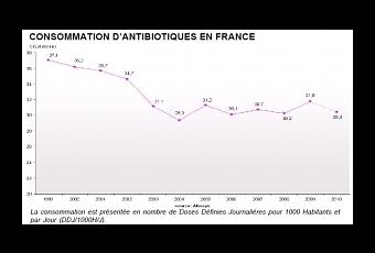 La France reste toujours nettement au-dessus de la moyenne européenne de consommation d'antibiotiques, parmi les pays présentant la plus forte consommation. Malgré de régulières campagnes d'information pour limiter la consommation et la prescription d'antibiotiques en France, si en 10 ans, cette consommation a baissé globalement de 16%, ce bilan de l'Afssaps, élaboré à partir des données de ventes et de remboursement fait état, depuis 2005, d'une tendance à la reprise.