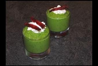 Au moment de servir, ajoutez une touche de chantilly et les lamelles de bacon sur les verrines.