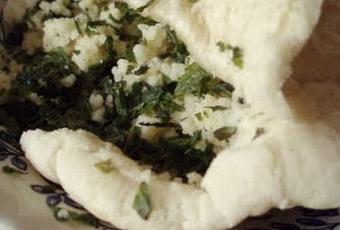 Mettez à gonfler le couscous dans l'eau bouillante (juste à hauteur) pendant 1/2 heure. Pressez la pomme de terre. Mixez l'oignon nouveau. Ajoutez au couscous gonflé l'oignon mixé, la purée, l'ail émincé et en petits cube, le jus de citron, le tahin. Ajoutez un peu d'huile d'olive et du jus de citron si la pâte est trop compacte.