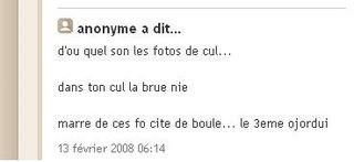 Voilà le commentaire que j’ai eu dans ce faux site créé temporairement pour faire une farce à La P’tite Dame et à Balmeyer !