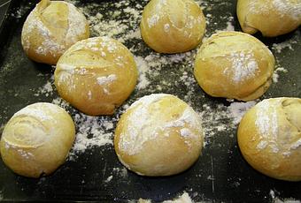 Le pâton a doublé de volume , sortez-le dégazez-le en l'aplatissant rapidement coupez-le en 8 boules travaillez-les et mettez les sur la plaque du four légèrement huilé et fariné. Laissez-les lever à nouveau , mouillez-les, farinez-les, incisez-les et cuisez-les 20minutes à 200° (sans oublier de mettre de l'eau dans la lèche frite).